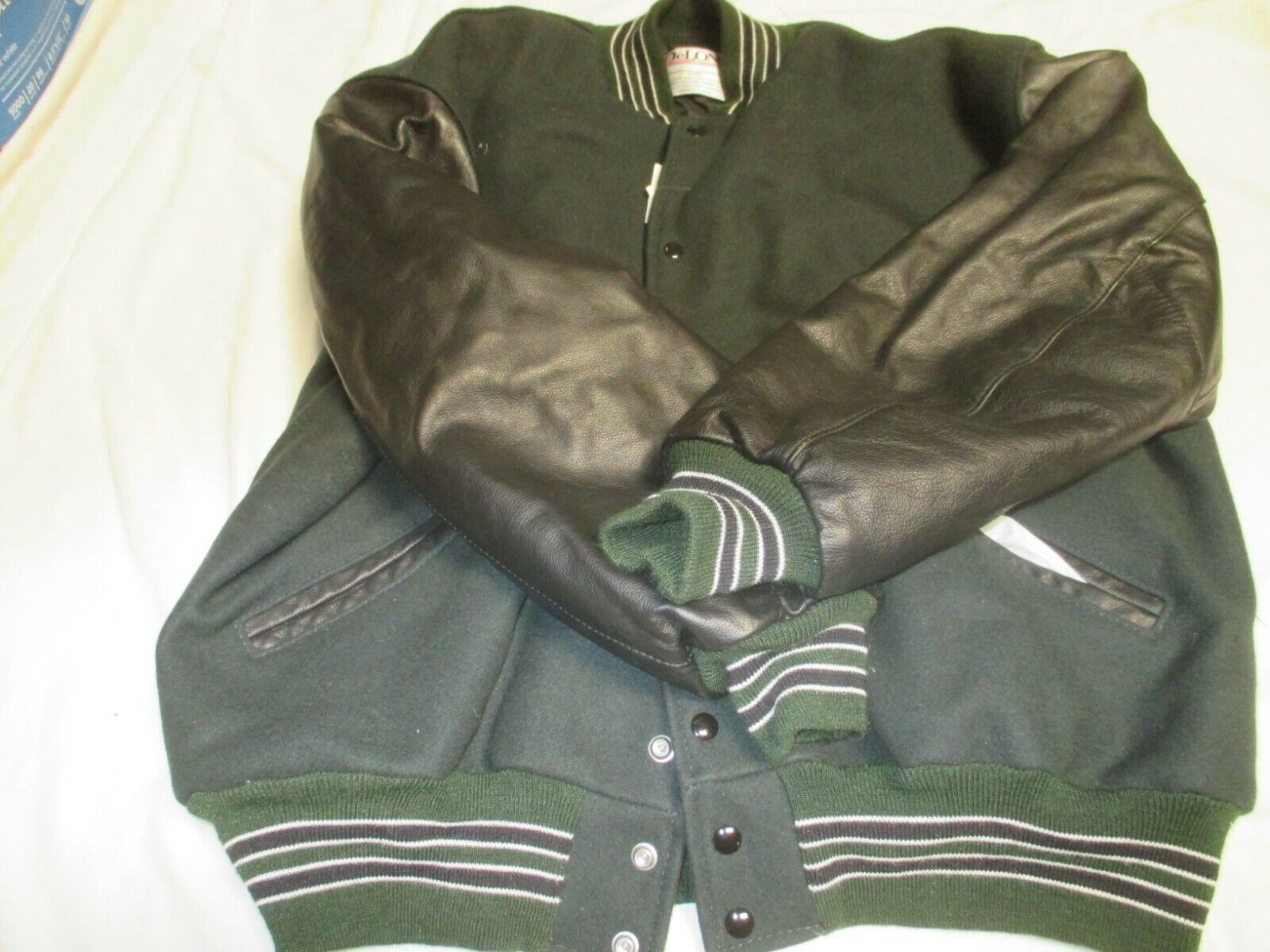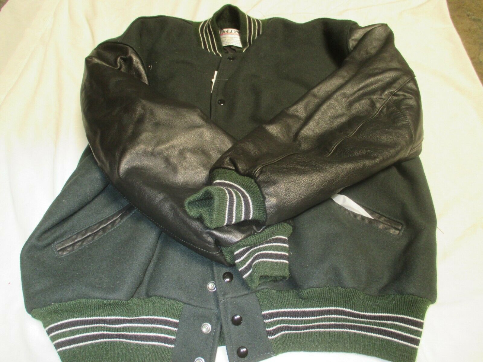 DELONG ADT DK GRN BODY& BLK SLEEVE QLT LINED 2 BLK STRIPES OUTLINE IN WHTJACKET