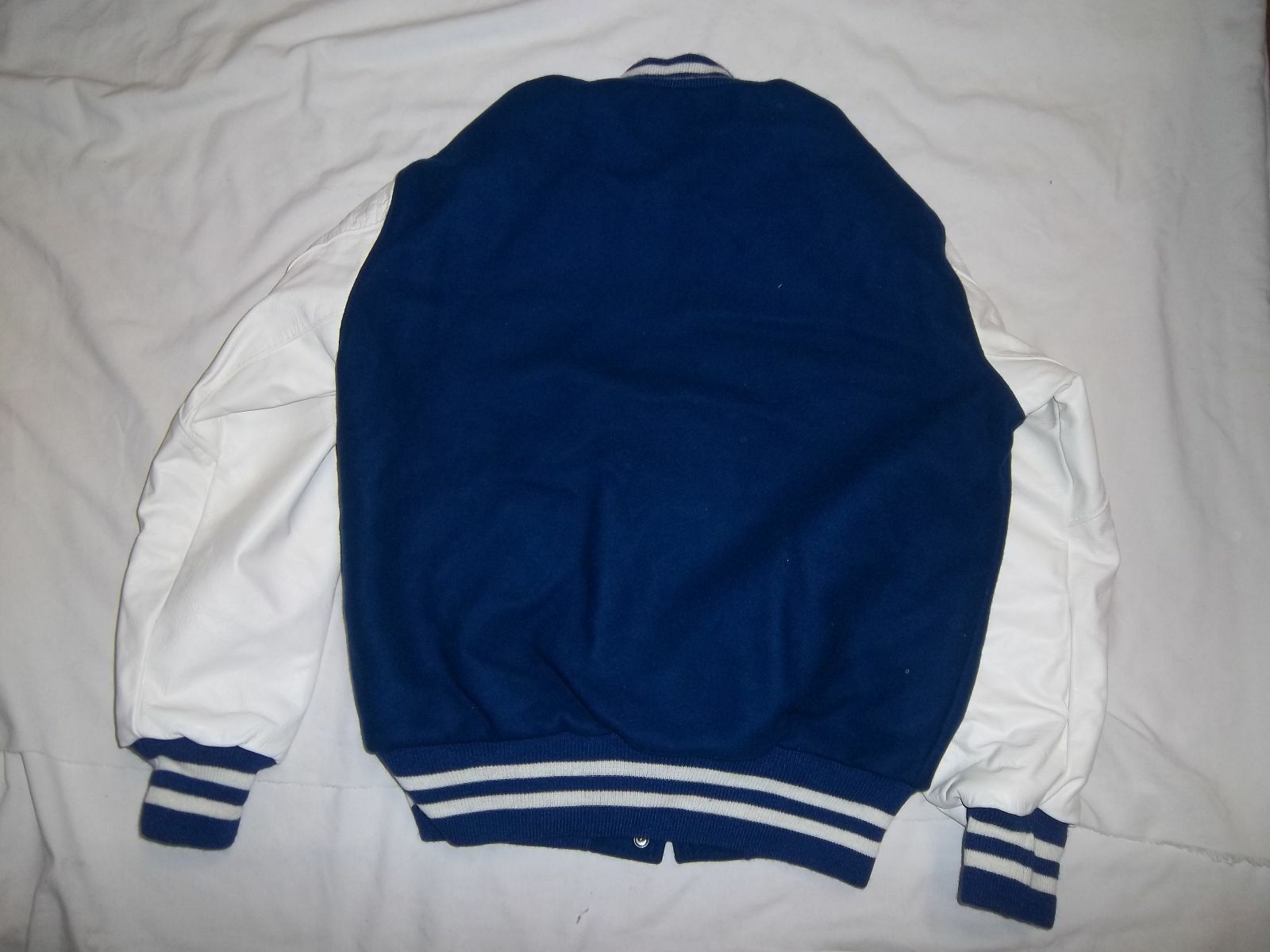 DELONG ADULT ROYAL BLUE WITH TWO WHITE STRIPES QUILT LINED SCHOOL LETTER JACKET